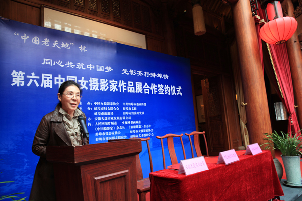 中国女摄影家协会副主席、秘书长吕静波在讲话中说:中国女摄影家协会是国家一级社团组织,以联络、协调、服务女摄影家为职能,是党和政府联系女摄影家的桥梁和纽带。自成立以来,开展了多种形式的大型摄影活动,在社会上产生了广泛影响。特别是两年一届的会员作品展已经成为我会常规性的品牌活动项目,已经连续举办五届的作品展集中展示了会员近年创作的优秀作品。《第六届中国女摄影家协会会员作品展》暨《中国女摄影家眼中的蚌埠摄影作品展》将在美丽的蚌埠“中国老天地”古民居博览园举行,届时将通过一幅幅精美的摄影作品,展示中国女摄影家对实现中华民族伟大复兴“中国梦”的坚定信心,展示中国女摄影家为开拓中国摄影事业、繁荣社会文化经济的丰硕成果,展示蚌埠经济、文化、城市建设的新形象。同时全国百名女摄影家和女记者将云集蚌埠,走进基层、走进国家级的文化产业园区和风景区“中国老天地”,用女性独特的视角、细腻的情感聚焦蚌埠,捕捉规模最大、类型最多、文化含量最高的中华古民居第一园的风采,让古代民居真正‘活’起来‘传’下去,用手中的相机将蚌埠的美丽、“中国老天地”古民居博览园亮点传播到世界各地!