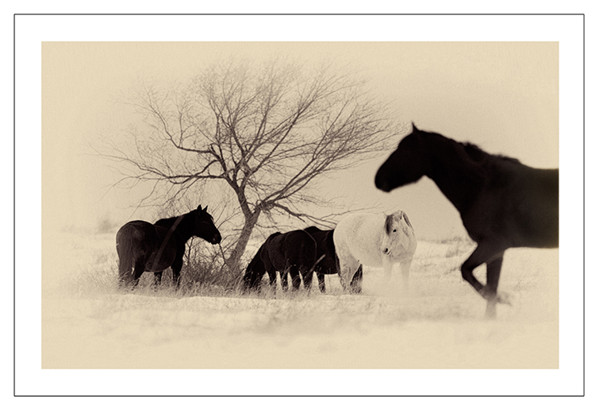 李刚的作品《马》曾获得中国摄影金像奖。他镜头表现的不是马的强悍勇猛,而是表现生命之天性。雪原上,或奔跑,或悠闲,自由自在,无拘无束,映射出摄影者清纯心境的追求。李忠曾以航拍“中华龙图腾”闻名于世。他拍摄的马,强调主观感受,表达马的伟岸雄阔,腾云踏雾,一往无前,他拍摄的龙马精神获得“香港中华摄影金龙奖”和“终身成就奖”。而生活在京城的张耕畦,从纪实摄影到钟爱马,拍摄了很多精彩的作品,曾在平遥国际摄影节、北京国际摄影周中进行多次展出。生长在蒙古草原的呼努苏图,有着牧马人的性情。他的摄影强调大自然中人与马的亲近,马与人的和谐,纪实性与艺术性结合得十分完美。涂向东书法功底不凡,他拍摄马,别具特色。他注重背景的象征,讲究色调的运用,许多作品凸显古典油画的质感。