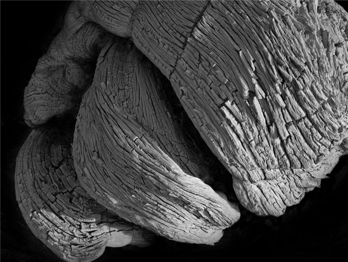 “三千年的胡杨,一亿年的历史。”在极简的静物拍摄方式下,运用高像素数码相机的高品质,这组影像一丝不苟地将胡杨木的复杂构成和独特美感抓取出来,将它的肌理和特质十分清晰、细致地完全呈现,以十分隆重的视觉方式让它们的存在获得了凝视,时光仿佛在历史的年轮中干涸,甚至,我们可以感受到时间的裂缝,隐藏着关于时空与人性的种种,在不同的时空里,众多的其他意义被灌注到胡杨的肖像中,惊喜、感叹、忧伤、迷惘……一幅一幅,传达出挚烈的情感和强大的启示。